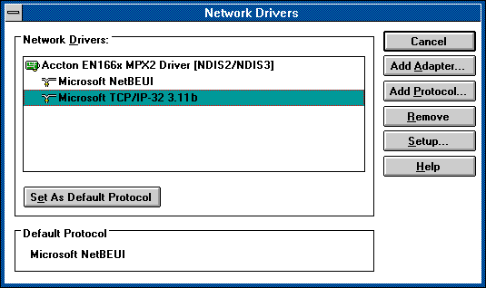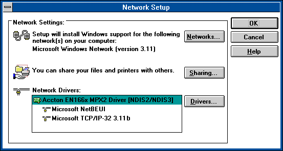 Your screen probably doesn't show "Microsoft TCP/IP-32 3.11b" yet. (If it does, then jump to here.) Also, the line indicating the ethernet card installed should reflect what you have installed. Click on the Drivers... button.