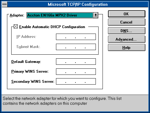 Yeah, I know, WFWG is obsolete. But wouldn't it be neat to do something valuable with that 486 that is pining away in the back of your closet? Most cable modem and DSL services don't support Windows for Workgroups anymore. Well, the cable modem will connect quite nicely with the Microsoft TCP stack. But first you have to make sure that you have the latest version of Microsoft's TCP/IP stack installed and configured. (Well, even before that, you must have an ethernet card installed and its drivers loaded in Windows. That is card specific, and won't be covered here. It is assumed....)