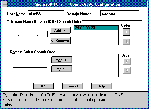 To set your DNS, use a known good Windows 9x computer and run winipcfg, choose More info >> and write down the address that is displayed for your DNS server. Then go to your WFWG machine and do Network Setup/TCP/Setup/DNS. You should see a screen like this: